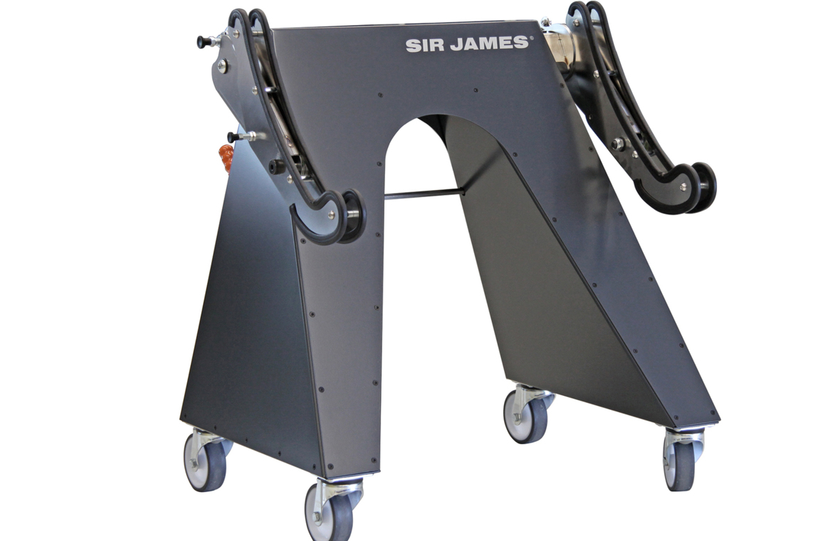 Bei Nichtverwendung können die Aufnahmearme nach unten geklappt und „Sir James“ kann platzsparend in der Werkstatt abgestellt werden.